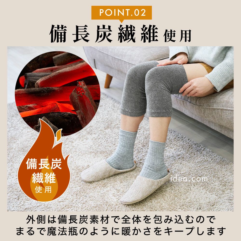 また、使用されている「東洋紡エクス」糸は、汗の水分で発熱する特性を持ち、備長炭繊維とのダブル効果で温感を高めます。冷えが気になる方や、長時間のデスクワーク・立ち仕事でひざに負担を感じる方におすすめです。