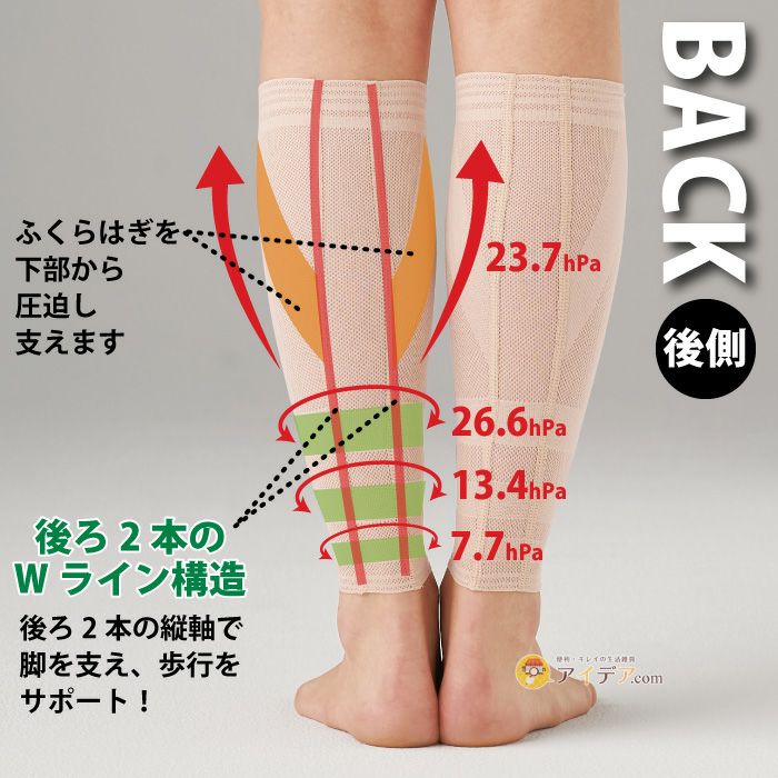 | ■使用上のご注意 | ●本品は医療用具ではありません。●高血圧の方や妊娠中の方、現在医師の治療を受けている方は、ご使用前に医師にご相談ください。●キズ、はれもの、湿疹などお肌に異常のあるときは使用しないでください。●ふくらはぎ以外の部位には使用しないでください。●ご使用前に必ず『装着方法』をよく読み、正しく装着してください。●鋭利なものなどでひっかけないようご注意ください。●装着の際は爪やアクセサリーで引っかけないようご注意ください。破れる恐れがあります。●商品の仕様上、内側に糸が少し出ている部分がありますが、絶対に切り取らないでください。破れる恐れがあります。●長時間使用する際や締まりすぎと感じる場合は、適度に着脱を繰り返してください。また、就寝時のご使用はお避けください。●使用中、使用後に異常を感じた場合は使用を中止してください。●日光や蛍光灯に長時間あてると変色する恐れがあります。●洗濯機の手洗いモードでは洗えません。●本品は洗濯により収縮する恐れがありますので形を整え陰干ししてください。●火気に近づけないでください。●本来の用途以外には使用しないでください。●使用感には個人差があります。 | ||