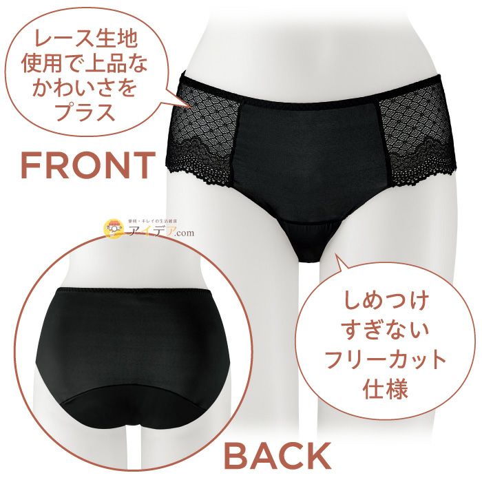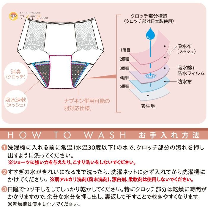| ■使用上のご注意 | ●ご使用中、お肌に異常が現れた場合は直ちに使用を中止し、専門家にご相談ください。●使用時の行動や動作によっては、液体が染み出たり漏れ出す可能性がありますのでご注意ください。●クロッチ部は素材の特性上乾燥に時間がかかるため、十分に脱水し裏返して干してください。●クロッチの一部にポリウレタンフィルムを使用しています。使用頻度に関わらず経年により加水分解を起こし劣化します。●併用した生理用ナプキンをはがす際、ナプキンの粘着力が強いと、本品のポリウレタンフィルムがはがれる場合があります。●気候などによって乾きにくい場合は、エアコンや扇風機などで、十分乾燥させてからのご使用をおすすめします。●素材の特性上、摩擦などで毛玉が出来ることがあります。●着用の際、鋭利なものや爪などでひっかけないようご注意ください。●吸水部が破損した場合は、漏れ出すことがありますのでご使用にならないでください。●汗などが付着した状態で重ね置きすると、衣服などに色移りする恐れがあります。●本品は洗濯により伸縮する恐れがあります。●使用感には個人差があります。●火気厳禁。 | ||