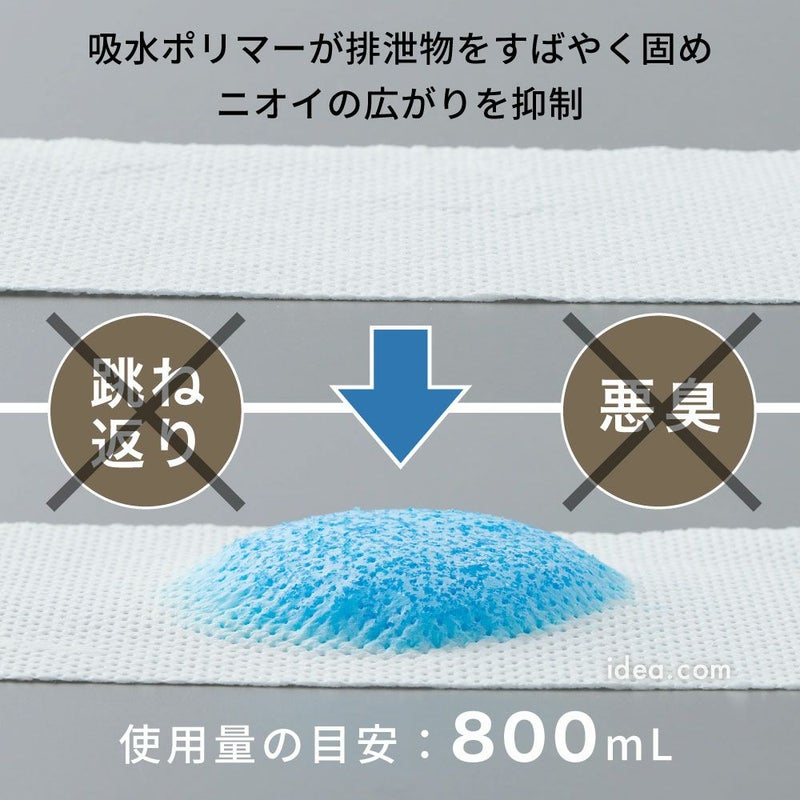 | ■使用上のご注意 | ●吸水ポリマーシートは食べられません。お子さまが口に入れないようご注意ください。万一、食べた場合は本品を持参し医師に相談してください。●お子さまが使用する際は、保護者の方が注意して使用させてください。●鋭利なもので突き刺さないでください。●水分が多いとすべて吸水できない場合があります。●吸水が不十分な場合、もれる恐れがあります。●お薬を服用されている方・尿や便に異常がある場合は固まりにくい場合があります。●水洗トイレには流せません。●汚物を処分する際は、各地方自治体の条例に従ってください。●高温多湿の場所で保管しないでください。●火気厳禁。 | ||