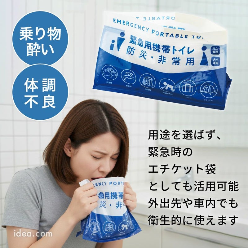 ![]() ガバっと広げて置くだけ! 両手が使える携帯ミニトイレ 災害や断水でトイレが使えなくなる状況は、誰にでも起こりうる身近なリスクです。いざという時に備えておくことで、不安や不快を大きく減らせます。「COGIT防災 緊急用携帯ミニトイレ3個組」は、広げて置くだけで準備ができ、衛生的に処理できる安心の簡易トイレ。ご自宅、防災リュック、車内など、どこにでも備えておけるコンパクト設計で、幅広い世代が安全に使える防災アイテムです。 ![]() 便座いらずで ガバッと広げて置くだけ! ![]() 便座の必要がなく、緊急時にも迷わずすぐ使える、シンプルな設置構造。広げて置くだけで形が安定し、初めての方でも直感的に使える安心設計です。 大きく開いて使いやすい![]() 開口部が大きく、姿勢を崩さず使用できる形状。狭い場所でも使いやすく、周囲を汚しにくい構造で衛生面にも配慮しています。 前飛び防止パッド付![]() 尿の飛び散りを防ぐ前面パッドを搭載。室内や車内など、汚れを避けたい場所でも安心して利用できる工夫が施されています。 自立するから両手が使える![]() 本体がしっかり自立するため、支える必要がなく両手が自由に使えます。高齢の方や子どもでも安心して扱える仕様です。 瞬時に溶けて凝固する吸水ポリマーシート![]() 吸水ポリマーシートも3枚付属。水に触れると吸水ポリマーがすばやく凝固。すぐに使えて、すぐに固まる、だから快適! 素早く固めて悪臭を防ぐ![]() 吸水ポリマーシートは水分をすばやく固めるだけではなく、ニオイの広がりを抑制。処理の負担を軽減し、衛生的に片付けられます。 男女 子供 シニア 大小兼用![]() 年齢や性別を問わず、誰でも使いやすいユニバーサル設計。ご家庭用、防災用として家族全員分の備えに適しています。 エチケット袋としても![]() 用途を選ばず、緊急時のエチケット袋としても活用可能。外出先や車内でも衛生的に使える便利なアイテムです。 コンパクトに持ち歩ける![]() 折りたためば小さくなるため、防災バッグや車の収納にも無理なく入ります。常備しやすく、携帯性に優れています。 捨て袋も付属![]() 使用後の処理がしやすい専用捨て袋付き。中身やニオイが外に漏れにくく、清潔に廃棄できる安心のセットです。 ![]() ![]() 災害や断水といった日常の延長にある「もしも」は、いつ訪れるか分かりません。そんな予測不能の状況で大きな負担となるのが、トイレの確保です。衛生環境が不安定になると、心身へのストレスは一気に高まり、避難生活にも影響が出てしまいます。「COGIT防災 緊急用携帯ミニトイレ3個組」は、そうした不安を少しでも軽減し、誰もが安心して備えられるよう考えられた簡易トイレセットです。 |