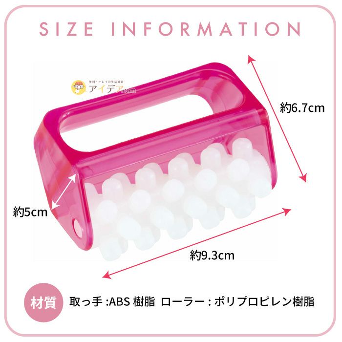 | ■使用上のご注意 | ●ローラーがスムーズに回転することを確認した上でご使用ください。●長時間のご使用はお避けください。●ローラーを激しく回転させると摩擦でローラー と取っ手の接続部が摩耗することがありますのでご注意ください。●お肌の弱い方はご使用をおやめください。●傷やはれもの等、お肌に異常がある場合や日焼けしたお肌にはご使用にならないでください●使用中、または使用後に赤み、はれ、かゆみなどの異常があらわれた場合は使用を中止し、皮膚科専門医等にご相談ください。●使用感には個人差があります。●ご使用後は水または石けん水で洗い、水気をよく切り日陰で自然乾燥させてください。●お子様の手の届かない所に保管ください。 | ||