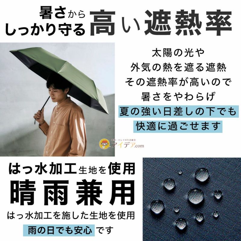 | 機能性 | 日傘 折りたたみ 完全遮光 放射冷却 体感-10℃以上の冷却効果 UVカット率約99.9% UPF50+ 遮光1級 近赤外線カット 遮熱 はっ水 グラスファイバー 晴雨兼用 軽量 黒コーティング 裏面黒 日焼け止め UV 紫外線 紫外線対策 日除け 涼しい |