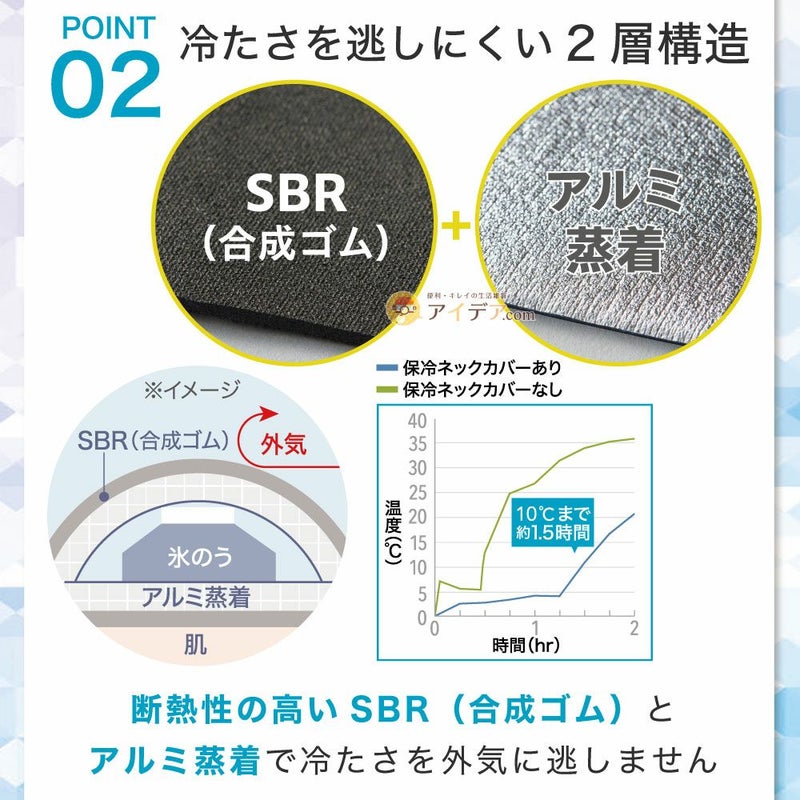 | 機能性 | 冷たさを逃しにくい二層構造 SBR(合成ゴム)+アルミ蒸着 首まわり2段階調節可能 保冷剤 OK |