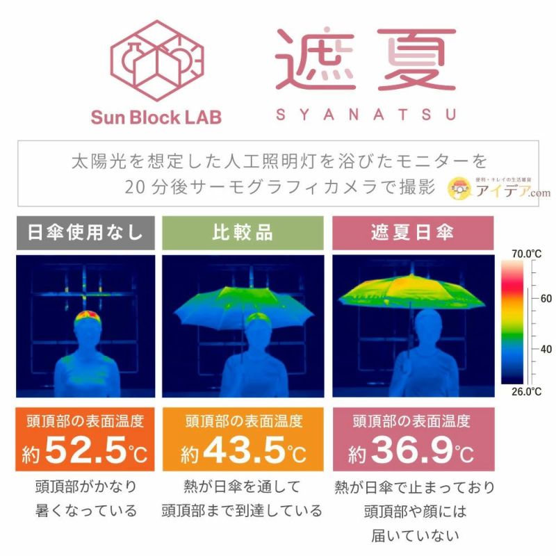 | 放射冷却生地使用で体感-10℃以上の冷却効果! サンブロックラボ 遮夏クール晴雨兼用傘 ![]() すぐに購入したい方はこちら ![]() ![]() ![]() ![]() ![]() ![]() Sun Block LAB 夏をブロック!暑さを乗り切る快適さを追求 年々暑くなる気象にも、強い日差しにも負けない。今より夏を快適に過ごすためのお手伝いがしたい…そんな想いから、独自に開発した機能生地を使用した暑さ対策アイテムが誕生しました。それがサンブロックラボです。 【遮夏クール晴雨兼用傘】は、【遮夏クール晴雨兼用傘】は、太陽の熱を受けて反射する放射冷却生地を使用、体感-15℃の冷却効果!UVカット率約99.9%で、気になる紫外線を徹底カット!たるみや光老化の原因になる近赤外線もカットします。 太陽の光や外気の熱を遮る遮熱。その遮熱率が高いので、暑さをやわらげ、夏の強い日差しの下でも快適に過ごせます。はっ水加工生地を使用しており、晴雨兼用。親骨が軽量で丈夫なグラスファイバー8本骨の構造で、軽くて持ち歩き楽々!毎日の通勤通学におすすめです。 シンプルにこだわったデザインで、縁にはリボン生地を使用。シンプルなデザインとカラーだから大人も日常で使いやすく、お友達や家族へのプレゼントにも。 夏と戦うみなさまの多様なニーズに応えることを目指して…サンブロックラボ ![]() |