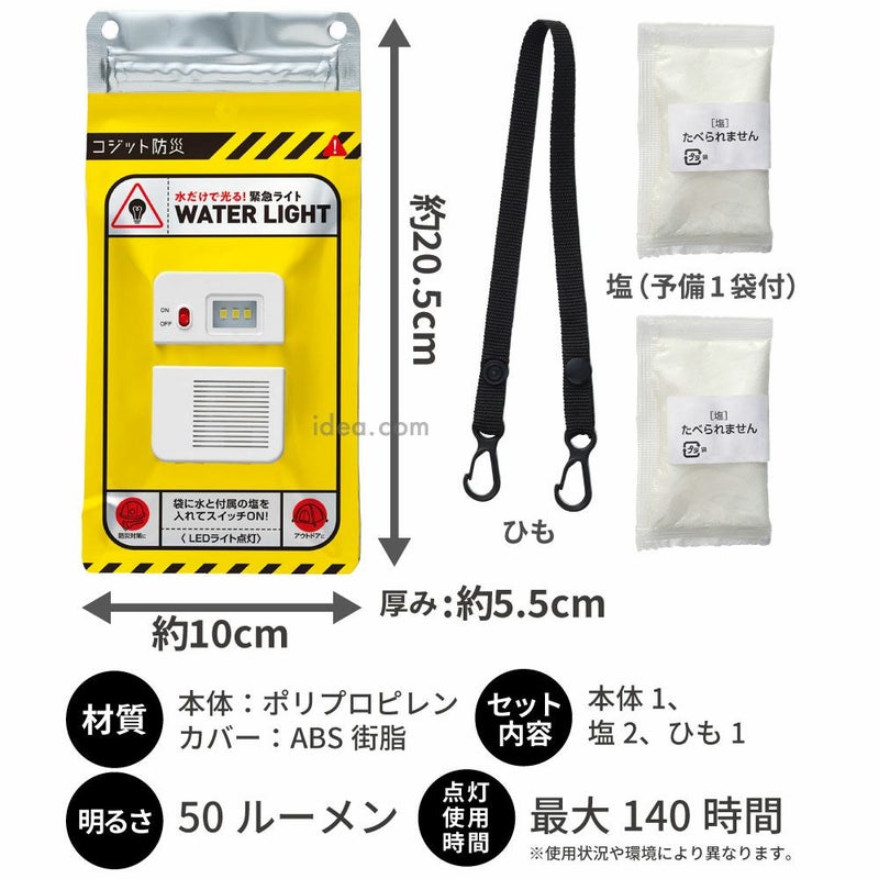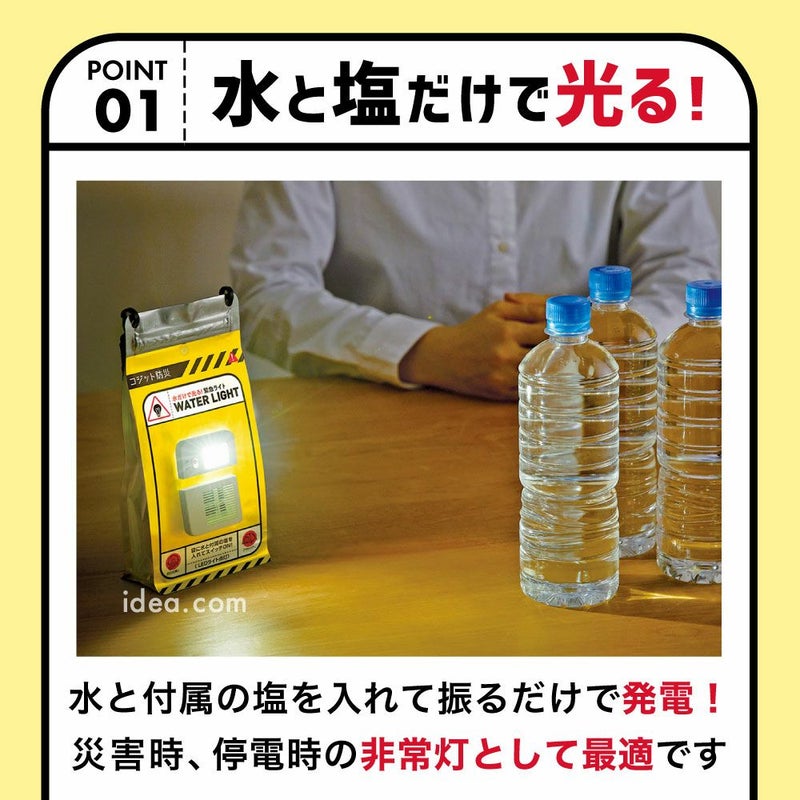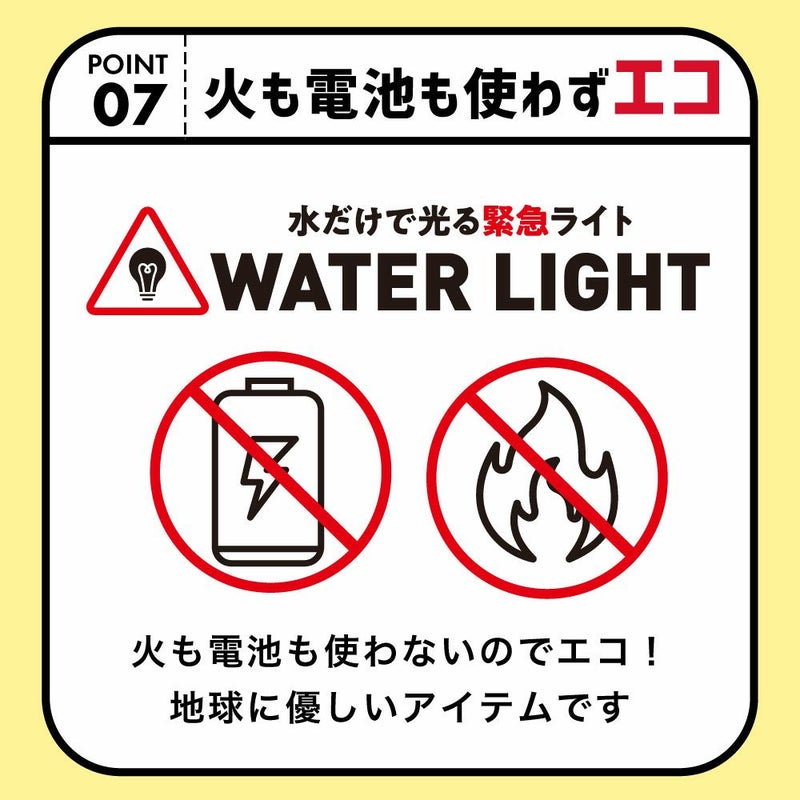 | 火も電池も必要なし!水と塩だけで点灯する緊急ライト COGIT防災 水だけで光る緊急ライト ![]() ![]() ![]() ![]() ![]() ![]() ![]() ![]() 火も電池も乾電池も充電も必要なし! 水と塩だけで点灯する緊急ライト 突然の停電で、懐中電灯もロウソクもない…スマホのバッテリーも残り少ない…真っ暗な部屋は危険がいっぱいです!いつ起こるか分からないのが災害だから、備えあれば憂いなし!水だけで光る緊急ライトを備えて防災対策を! 水と付属の塩を入れて振るだけで発電!災害時、停電時の非常灯として最適です。水と塩を入れ、振って2分でOK!災害時でも慌てずにお使いいただけます。連続で最大140時間、約8日間もちます。スイッチを切っている間は電気が減らずお得!連続使用しない場合は、水を入れてから約2週間使用できます。 このライトの明るさ:50ルーメンは、手元や足元を照らすのに十分な明るさで、数メートル先の視野を確保するのにも適しています。コンパクトで軽量だから持ち運びラクラク!付属の紐を本体に通して持ち歩いたり、バックやリュック、アウトドアでは木などにぶら下げる事も可能です。 火も電池も使わないのでエコ!地球に優しいアイテムです。 |