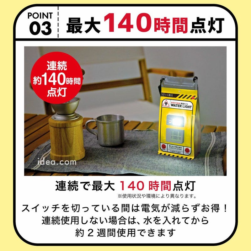 | ■使用上のご注意 | ●袋の中の液体は飲み物ではありません。●小さなお子さまの手の届かないところで使用してください。●本品の分解や改造、または修理を絶対にしないでください。●水は裏面記載の水位ラインまで必ず入れてください。●付属の塩以外をご使用にならないでください。●塩が溶けていない場合は点灯しません。点灯しない場合、塩が溶けるまで軽く振ってください。●本品に水を入れたあとは、本体を逆さまにしたり、強く振ったりしないでください。水がもれる恐れがあります。●本品は、塩水と製品内のアルミ板の化学反応により発電します。約140時間はオン・オフを繰り返して使用できます。●連続最長点灯時間は約140時間です。ただし、条件によって最長点灯時間は異なります●-10°C以下の環境ではご利用になれません。●約140時間以上使用したもの、あるいは水を入れてから2週間経過したものは廃棄してください。廃棄の際は、お住まいの自治体に処理方法をご確認ください。●火気厳禁。 | ||