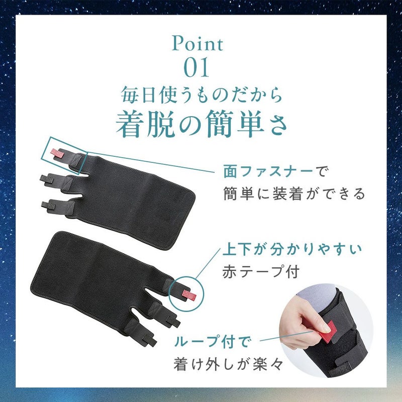 | ■使用上のご注意 | ●使用中、使用後に気分が悪くなったり身体に変調がおきた時は、使用時間に関係なくすぐにご使用をおやめください。●アレルギー体質の方や敏感肌の方、妊婦その他の病気などで医師から手当てを受けている方はかかりつけの医師にご相談ください。●慣れないうちは長時間の使用は避け、無理をせず徐々に慣らしながらご使用ください。また、ベルトを強く締めすぎないようご注意ください。●鋭利なものでひっかけないようご注意ください。●臭いが気になる場合は、日陰で風に十分さらしてからご使用ください。●生地の特性上、面ファスナーの着脱をくり返すことで毛羽立ちが生じます。●本品の面ファスナーで衣類などを傷つけないようご注意ください。●洗濯機の手洗いモードでは洗えません。●お子さまの手の届かない所に保管してください。●包装用の袋で遊ばないでください。窒息など思わぬ事故の原因となります。●使用感には個人差があります。●火気厳禁。 | ||