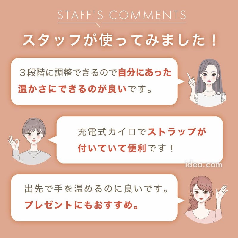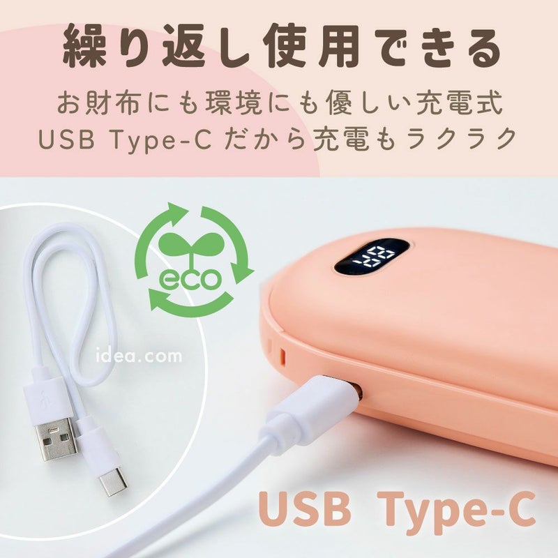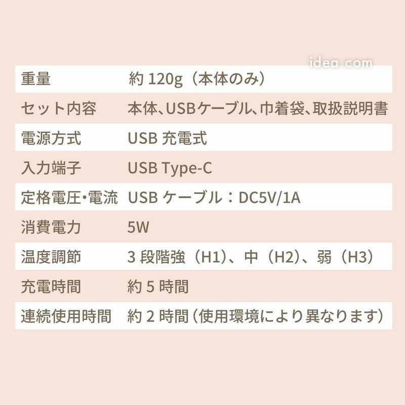 | 機能性 | USB充電式 3段階温度調節 繰り返し使える 省エネ 軽量 コンパクト設計 持ち運び便利 エコ設計 長時間持続 USB Type-C対応 スイッチ式操作 手触りなめらか 均一発熱 持続保温 |