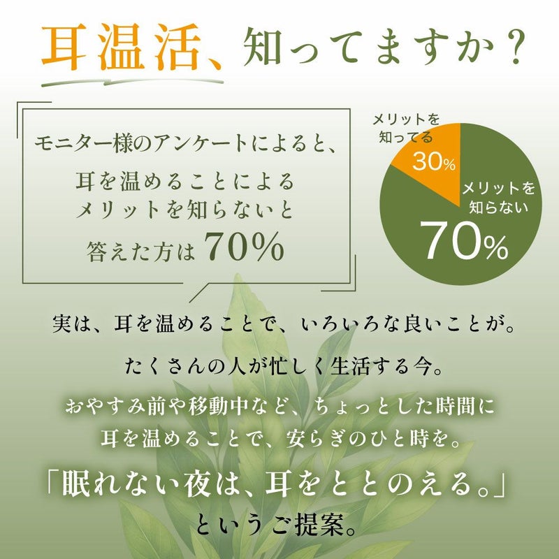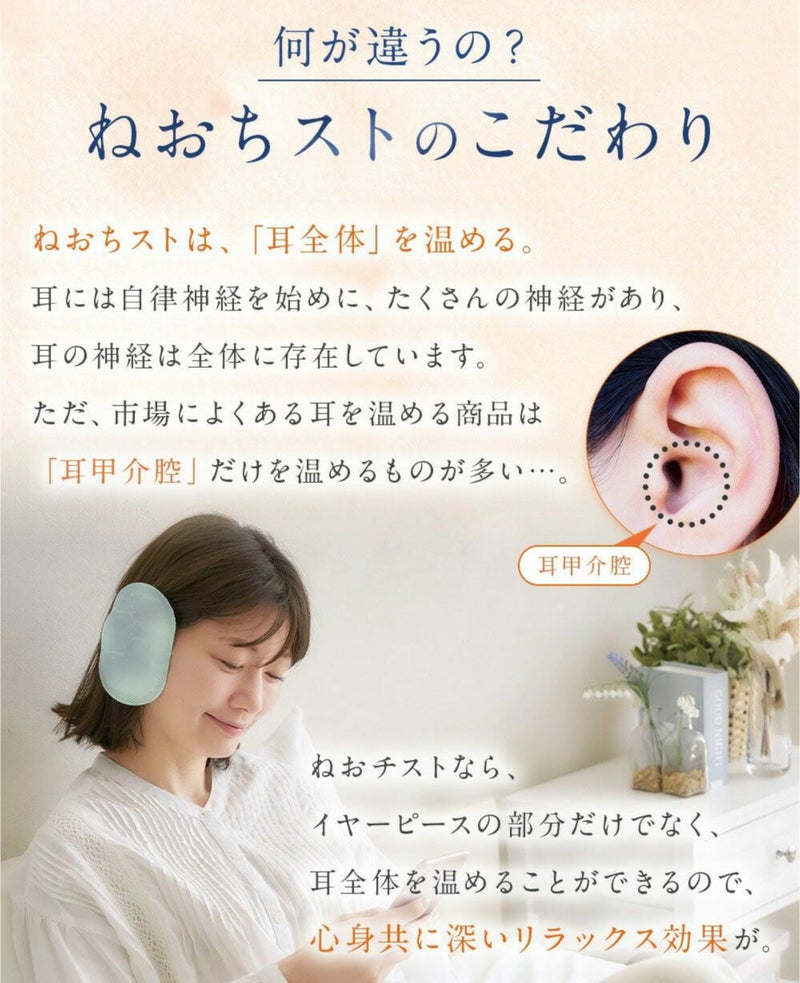 | とろ~んとあたたか、耳温活。抹茶の香り、新登場! ねおちスト 抹茶 ![]() すぐに購入したい方はこちら ![]() ![]() ![]() ![]() ![]() ![]() ![]() ![]() ![]() ![]() ![]() ![]() ![]() じんわりとろけてリセット。 すっぽり温め、とろける耳温活。 疲れた心と身体をやさしく包み込む、発熱タイプの使い捨てリラックスグッズ。 装着すると、約20分間温かさが広がり、耳全体を心地よく温めてくれます。抹茶の香り付きで、その香りに含まれる芳香成分は、交感神経の緊張を和らげ、副交感神経を優位にします。これにより、心拍数が落ち着き、深いリラックスを感じられるのです。おやすみ前や移動中、読書や音楽を楽しむひとときなど、さまざまなリラックスタイムにぴったり。 使い方はとても簡単。耳にかけるだけの2ステップ。内側にスリットがあり、両サイドのミシン目を調整することでサイズの調節も可能です。着用しにくいと感じた場合は、ミシン目を破って広げてご使用ください。 1セットに2枚入りで、計6セット(12枚)入り。 毎日使っても約1週間楽しめるボリュームです。 |
