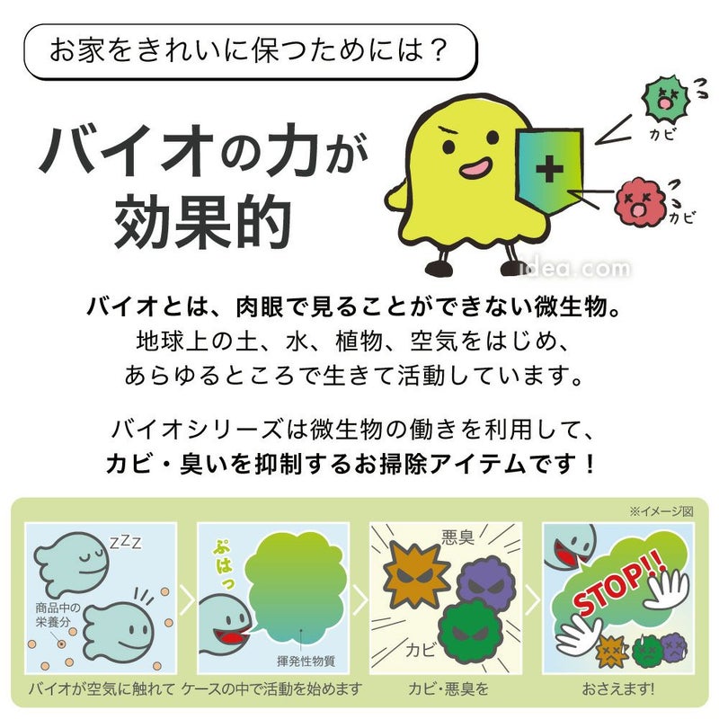 臭いに、防カビに、アカカビなど5種類のカビに!バイオとは・・・肉眼で見ることができない微生物。地球上の土、水、植物、空気をはじめ、あらゆるところで生きて活動しています。パワーバイオシリーズは微生物の働きを利用して、カビ・臭いを抑制するお掃除アイテムです。
