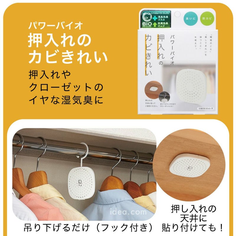 押入れやクローゼットの天井に取り付けるだけで、湿気臭やカビの繁殖を抑制。バイオが空気中に働きかけ、イヤな臭いを軽減。大切な衣類や布団を清潔に守り、収納空間を快適に保ちます。