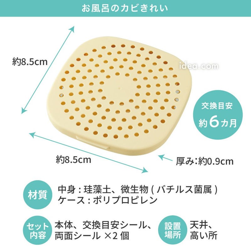 お風呂の天井に貼るだけで簡単にカビや臭いを予防。抗菌効果がさらにパワーアップし、消臭機能も追加。設置方法は「貼る」と「掛ける」が選べ、手間いらずで浴室を快適に保てます。シリーズNo.1人気のアイテム。