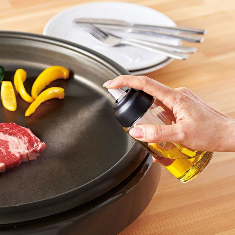 | ■使用上のご注意 | ●火を使う調理器具にご使用になる場合は、火から離れた安全な場所でスプレーしてください。火の近くで使用すると、火災の原因となる場合があり大変危険です。●目詰まりの原因となりますので、サラダ油以外には使用しないでください。●ボトルは耐熱ガラスではありません。直火、電子レンジ、オーブン、冷凍室及び、食器洗浄器、食器乾燥機では使用しないでください。●車内など、高温になる場所や直射日光が長時間あたる場所には置かないでください。●使用前および使用中に、キズやヒビなどが入った場合は使用しないでください。●ガラスは割れやすいので、洗浄時や使用時は丁寧にお取り扱いください。●キズつきや破損の原因となりますので、硬いものでたたいたり、擦ったりしないでください。また洗浄時に、タワシ、クレンザーなどは使用しないでください。●急激な温度変化で割れる場合があります。熱湯を注いだり、ボトルが熱い状態で冷たいものを入れたり、濡れたものの上に置かないでください。●ご使用の際は、スプレー口が自分や他人に向いていないことを確認してからスプレーしてください。●スプレーする際、本体を傾けすぎると霧状に出ない場合があります。●長期間使用しないと、中の油が固まり、、本品を詰まらせる場合があります。その場合は、お手入れ方法をご参照いただき、洗浄を行ってからお使いください。●スプレー口が固まった場合は、濡れふきんなどで拭き取ってください。●持ち運ぶ際は、キャップ部ではなく、必ずボトル部分を持って移動してください。●冷蔵庫では保管しないでください。また冬場の保管状況などで、油が出にくくなる場合があります。●液モレをおこす場合がありますので、横に倒して保管しないでください。●お子さまの手の届かない所に保管してください。また本品で遊ばないようご注意ください。●本来の用途以外には使用しないでください。 | ||