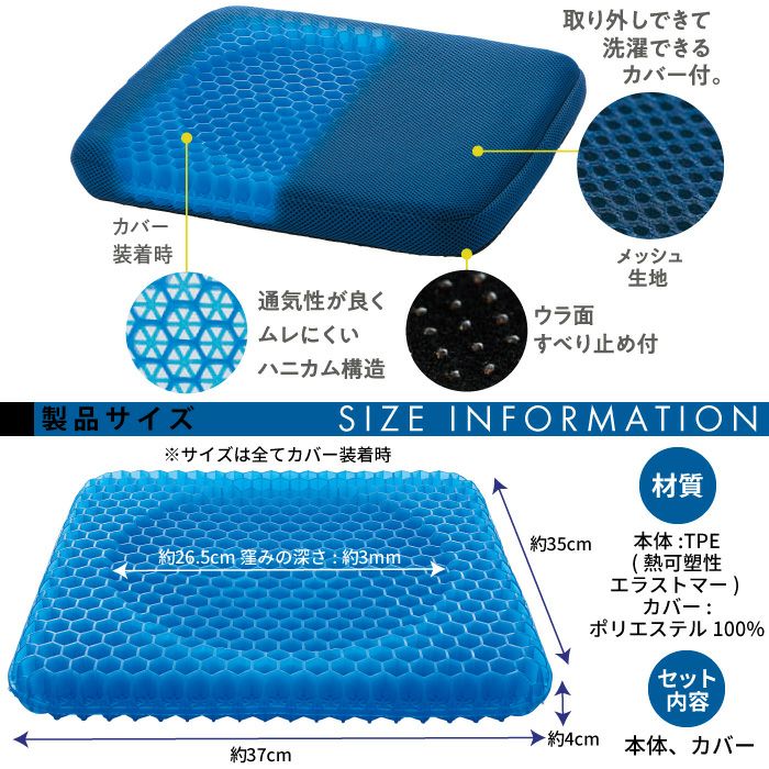 | ■使用上のご注意 | ●長くお使いいただくために、カバーを装着してご使用ください。クッションを2つ折りにして中に入れると簡単に装着できます。●素材の特性上、本体クッションを直接置いた場合、設置面がシミになる恐れがあります。●本品はカバーのみ洗濯できますが、洗濯機の手洗いモードでは洗えません。また、本体クッション材は洗濯できませんのでご注意ください。●本体クッション材が汚れた場合は、水に濡らし固く絞った布で拭き取り、完全に乾かしてからご使用ください。●合皮系のイスに長期間ご使用になると、カバー裏面の滑り止め剤がイス側に移行する恐れがありますので、ご使用はお控えください。●本体クッション材は弾力性のあるゲル素材を使用しております。平らな座面でご使用ください。座面が本品より小さいイスや座面に凹凸のあるイス、または沈みやすいイスなど、不安定な状態でのご使用はお避けください。●製造工程の都合上、本体ゲル素材に小さな凹凸、白い模様、気泡がある場合がございますが、品質には問題ありません。●過度の荷重や衝撃を加えたり、鋭利なものに近づけると破損する場合がありますのでお避けください。万一、本体クッション材が破損した場合はご使用をおやめください。●長時間、直射日光が当たる場所や、高温多湿の場所に放置しないでください。素材の特性上、変形する恐れがあります。●素材の特性上、まれに変色する恐れがありますが、ご使用上問題はありません。●カバー装着時はファスナーつまみ部を内側に収納してご使用ください。外に出ていると床やイスを傷つけることがあります。●危険ですので本品の上に立ったり、飛び跳ねたりしないでください。また、お子さまが本品で遊ばないようご注意ください。転倒など思わぬ事故の原因となります。●使用中、使用後に異常を感じた場合は直ちにご使用をおやめください。●輸送途中で本体クッション材が変形している場合があります。形を整えてからご使用ください。●袋から出した時に臭いが気になる場合は日陰で風に十分さらしてからご使用ください。●包装用の袋で遊ばないでください。窒息など思わぬ事故の原因となります。●お子さまの手の届かない場所で保管してください。●カバー装着時、ご使用を繰り返す内にクッション材がずれた場合は、カバーを軽く振って形を整えてからご使用ください。●カバーは水や汗などにより湿った状態で強く擦ったり放置すると、他のものや衣服に色移りする恐れがあります。濡れたまま放置せず、万一色移りした場合は早めに洗濯してください。また、つけ置き洗いはお避けください。●カバーは色落ちする場合がありますので、他のものと一緒に洗わないでください。また、洗濯により伸縮する恐れがありますので形を整え陰干ししてください。●カバーは素材の特性上、摩擦により毛玉が生じる場合があります。その際は無理に引っ張らずにハサミなどで取り除いてください。●火気に近づけないでください。●本来の用途以外には使用しないでください。●使用感には個人差があります。 | ||