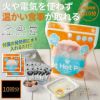 | ■使用上のご注意 | ●本品は調理器具ではありません。肉や魚などの生鮮商品を焼いたり煮炊きしたりすることはできません。生鮮食品の加熱調理には使用しないでください。●本品ご使用前に、発熱剤・加熱パックに記載されている注意事項をお読みのうえ、使用してください。●発熱する恐れがありますので、濡れた手で発熱剤を触らないでください。●高温の蒸気が出ますので、水を入れた加熱パックは周りに人がいない平らな場所で使用してください。●パック全体が高温になるため、加熱中は動かしたり、持ち歩いたりしないでください。●熱に弱い物の上や近くで使用しないでください。変形や変色の恐れがあります。●火気に近づけないでください。●加熱中は微量の水素ガスが発生します。●加熱パックが破れる恐れがあるため、食材を無理に詰めないでください。●加熱パックが破損した場合は使用しないでください。●加熱ムラが生じにくいよう、発熱剤と食材はできるだけ密着させて入れてください。●使用後の残水は飲まないでください。●発熱剤は使用直前に開封し、すみやかに使用してください。●発熱用の水量はお守りください。多すぎたり少なすぎたりすると十分に発熱せず、加熱効果が得られません。●気温や標高などの使用環境や食品の量などにより、発熱や温まり方に差が出る場合があります。●発熱剤の中身が誤って目や口に入った場合はすぐに流水で洗い流し、医師の診断を受けてください。●発熱剤を切ったり、破ったりしないください。発熱剤の中身が誤ってこぼれた場合は、素手で触らないようにし、大量の水の中に入れて発熱させてから処分してください。濡れた雑巾などでふき取ると発熱する恐れがあります。●アレルギー体質の方は、発熱剤に触れるとアレルギー反応を起こす場合がありますのでご注意ください。●使用後、発熱剤は十分に温度が下がってから、市区町村の区分に従って処分してください。●直射日光や高温多湿の場所には保管しないでください。●お子様の手の届かないところに保管してください。 | ||