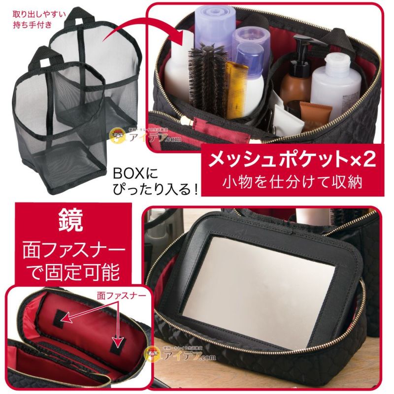 | ■使用上のご注意 | ●ご使用前に鏡表面の保護フィルムをはがしてください。●破損の原因となりますので、次のようなものは入れないでください。【高さ22cmを超えるもの・濡れたもの・過度に重いもの・鋭利なもの】●洗濯はできません。汚れが生じた場合は、乾いた布などでやさしく拭き取ってください。●強く擦ると他のものに色移りする恐れがあります。万一衣服などに色移りした場合は早めに洗濯してください。●落下等の衝撃や過度の力を加えると破損の恐れがありますのでご注意ください。●クレンザーなどで鏡を磨かないでください。●鏡はガラス製ですので、破損してケガをする場合があります。取り扱いには十分ご注意ください。●鏡に割れやヒビがある状態でのご使用はおやめください。●鏡に直射日光が当たると火災になる恐れがありますのでご注意ください。●付属のメッシュポケットの折りじわが気になる場合は、ドライヤーなどで軽くあたため、形を整えたあと、冷ましてから使用してください。また、ドライヤーを使用される場合はやけどにご注意ください。●高温多湿での保管、直射日光の当たるところでのご使用はおやめください。変形、変色、変質の原因となります。●お子さまの手の届かない所に保管してください。●火気に近づけないでください。●本来の用途以外に使用しないでください。 | ||