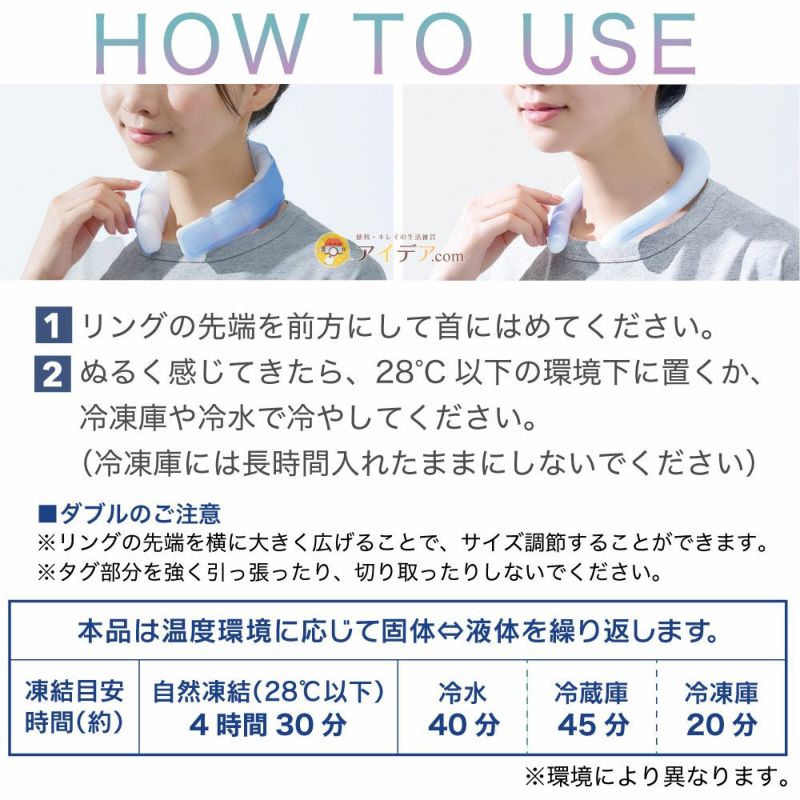 | ■使用上のご注意 | ●本製品は保冷剤ではありません。●50°C以上の場所や湿気の多い場所などに放置したり、50°C以上のお湯に入れたりしないでください。品質・性能が低下する可能性があります。●液体→固体を繰り返すため、気泡や山みなどが現れる場合がございますが、使用上の問題はございません。●着用時に締め付けを感じる場合は、固体の状態で先端を少し広げてから着用ください。●長期間の冷凍庫保管は本体の劣化の恐れがありますのでおやめください。●廃棄の際は各自治体の区分に従ってください。万が一、液漏れ等で排水口に流れてしまった場合は大量のお湯を排水口に流してください。●製品を無理に引っ張ったり、過度な荷重をかけたりしないでください。破損する恐れがあります。●破損、変形した場合は、直ちに使用を中止してください。●鋭利な物に触れないように気をつけてください。●万一、内容物が目や皮膚に付着した場合はすぐに大量の水で洗い流してください。また、飲み込んでしまった場合は無理に吐き出さずに医師の診断を受けてください。●本品着用時に息苦しいなどの違和感を覚えた場合は直ちに使用を中止してください。また、就寝時のご使用はおやめください。●汚れが付着した場合は、水で洗い流してください。●高温多湿の場所を避け、冷暗所に保管してください。●使用環境または保管環境によってはうまく機能しない場合があります。●お子様の手の届かない所に保管してください。●本来の用途以外には使用しないでください。●使用感には個人差があります。●火気厳禁。 | ||