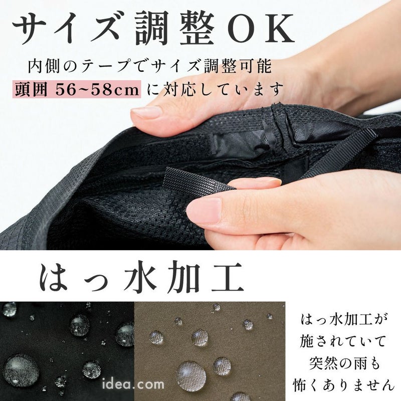 ■使用上のご注意 意●強風時は自転車でのご使用はお避けください。また、ツバが視界を遮らないようご注意ください。●本品は防水タイプの帽子ではございません。●本品は、はっ水加工を施していますが、洗濯を繰り返すことにより効果が低下します。はっ水効果がうすれてきた場合、市販のはつ水スプレーなどをかけてください。●型崩れには十分お気をつけください。●火気 厳禁。
