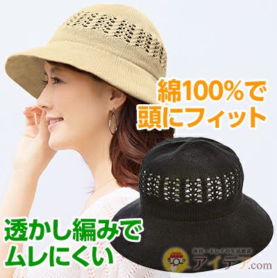 透かし編みのデザインがおしゃれで、綿100%のメイドインJAPANの機能的なUV帽子です。