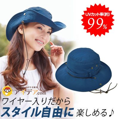「晴雨兼用はっ水サファリハット」は、約8.5cmの広めのツバなので、しっかり日差しをカット! また、ツバ部分にはワイヤーが入っているので、ツバの部分を自分で形を作ることができるので、自由にアレンジできちゃいます! それにワイヤー入りだから、下に垂れてきて、視界を妨げる心配がありません。 |